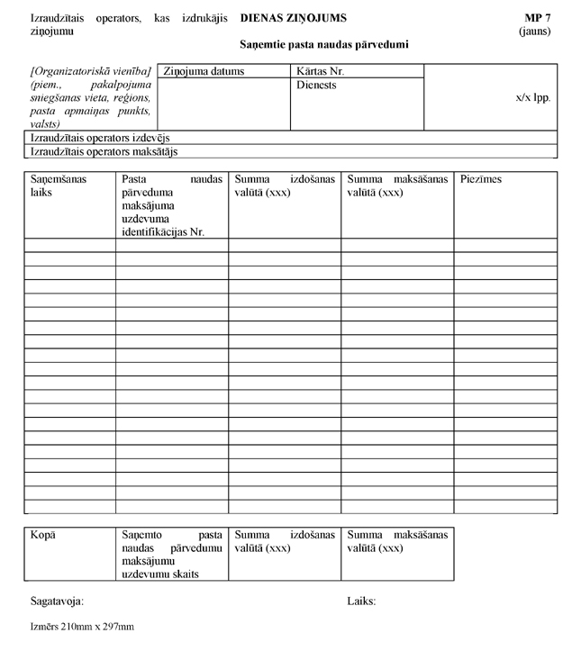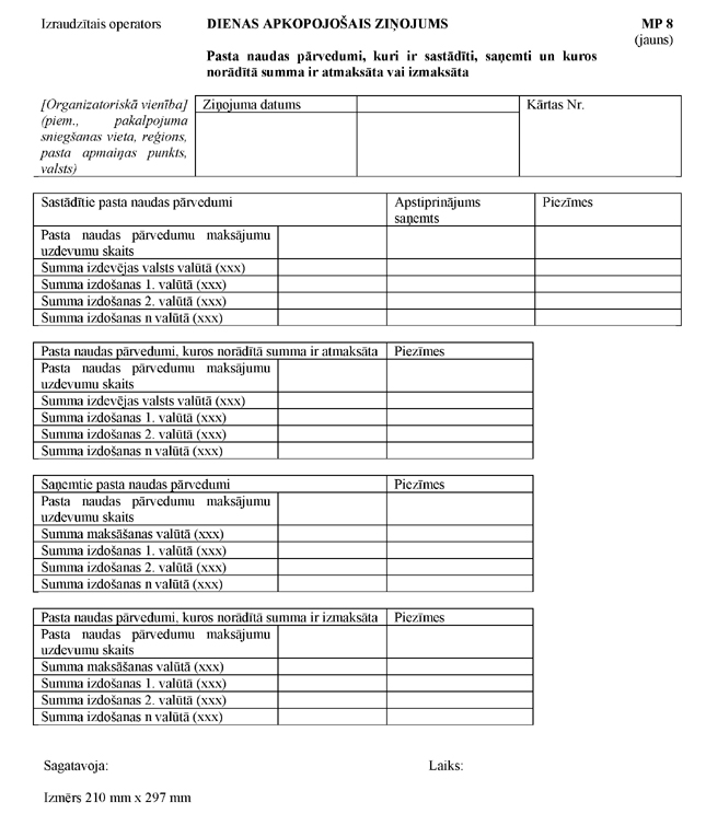 1. Izraudzītā operatora sistēmas sagatavotos dienas apkopojošos ziņojumus (MP 8 un VP 8) šis operators centralizē, tiklīdz attiecīgajā dienā beidz darbu pasta maksājumu pakalpojumu sniegšanas dienests.