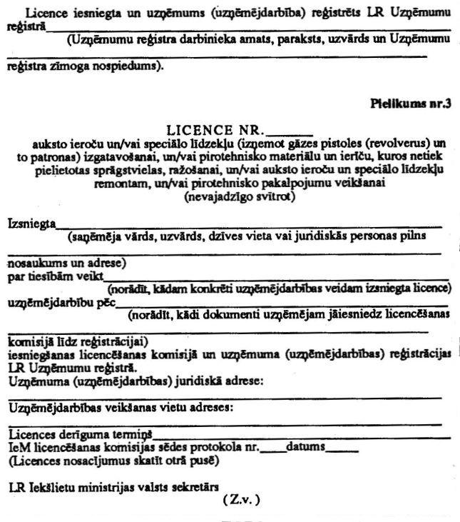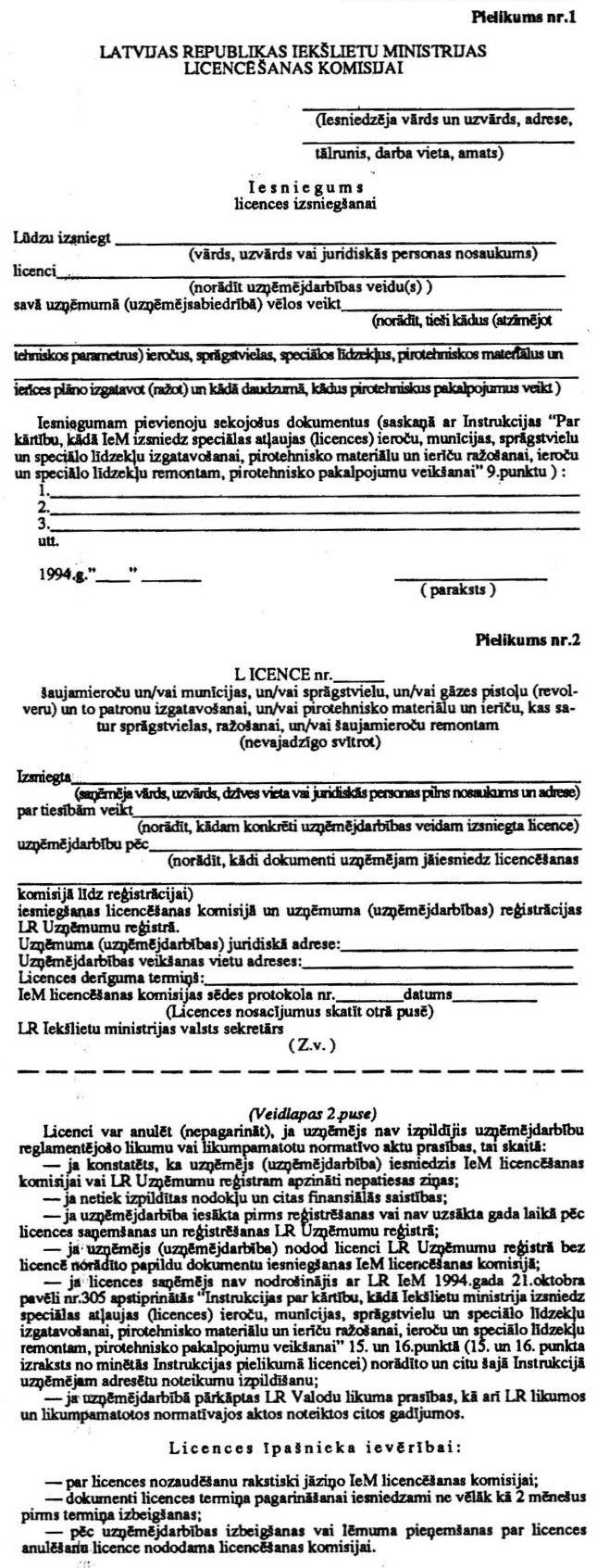 Speciālo atļauju (licenci) šaujamieroču, munīcijas, sprāgstvielu un gāzes pistoļu (revolveru) un to patronu izgatavošanai, pirotehnisko materiālu un ierīču, kas satur sprāgstvielas, ražošanai un šaujamieroču remontam var izsniegt ari valsts un pašvaldību uzņēmuma, kā arī privātam uzņēmumam (uzņēmējsabiedrībai), ja visi to dibinātāji un dalībnieki (fiziskas personas) ir Latvijas Republikas pilsoņi un, ja tajos to darbu izpildi, kas tieši saistīti ar šaujamieroču, munīcijas, sprāgstvielu un gāzes pistoļu (revolveru) un to patronu izgatavošanu, pirotehnisko materiālu un ierīču ražošanu, šaujamieroču remontu, kā ari uzglabāšanu, transportēšanu, apsardzi veiks šī punkta 1.daļas prasībām atbilstošas personas, par kurām IeM licencēšanas Komisijai iesniegti attiecīgi dokumenti saskaņā ar šis instrukcijas 9.7.apakšpunktu.