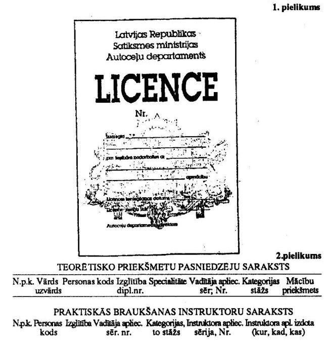 Licenci visu veidu transporta līdzekļu vadītāju apmācībai var saņemt: 1.4.1. Latvijas Republikas Uzņēmumu reģistrā reģistrēts uzņēmums, kura reģistrācijas apliecībā un (vai) statūtos paredzēta transporta līdzekļu vadītāju apmācība;