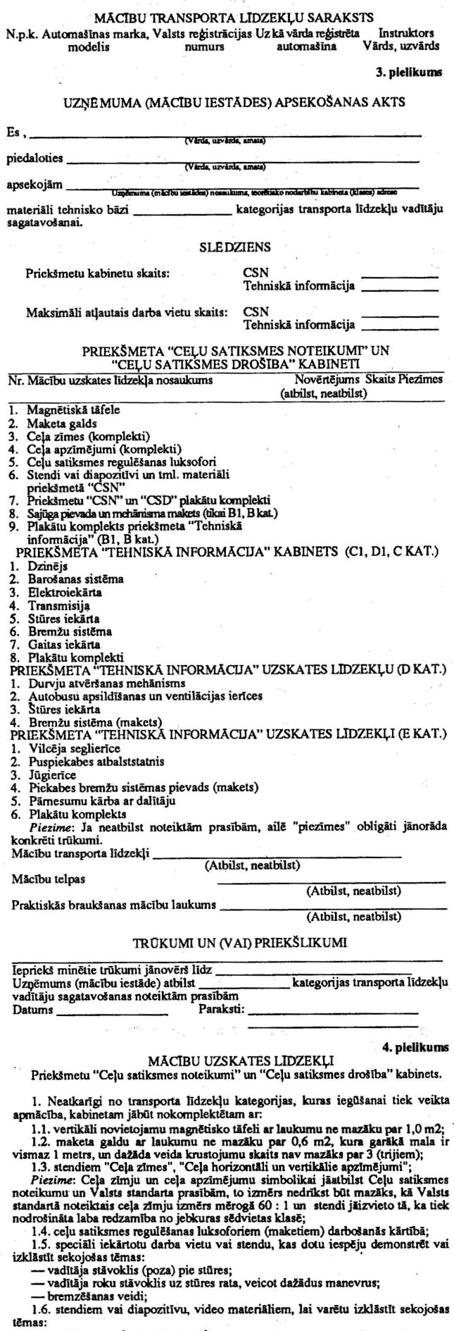 2.1.1. noteiktas formas pieteikums, kura norādīti uzņēmuma vai vidējās, vidējās speciālās, speciālās, augstākās mācību iestādes rekvizīti, visu teorētisko nodarbību kabinetu (klašu, laboratoriju) adreses, kā ari, ar kādu kategoriju transporta līdzekļu vadītāju apmācību katrā vielā paredzēts nodarboties;