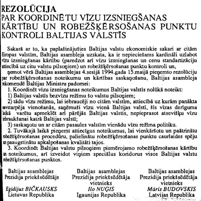 Rezolūcija par koordinētu vīzu izsniegšanas kārtību un robežšķērsošanas punktu kontroli Baltijas valstīs. Publicēts oficiālajā laikrakstā "Latvijas Vēstnesis", 15.11.1994., Nr. 134 https://www.vestnesis.lv/ta/id/240717