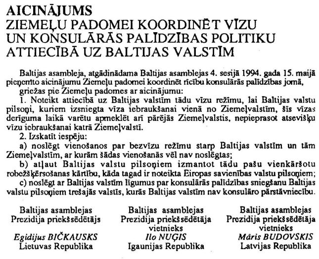 Aicinājums Ziemeļu padomei koordinēt vīzu un konsulārās palīdzības politiku attiecībā uz Baltijas valstīm. Publicēts oficiālajā laikrakstā "Latvijas Vēstnesis", 15.11.1994., Nr. 134 https://www.vestnesis.lv/ta/id/240718