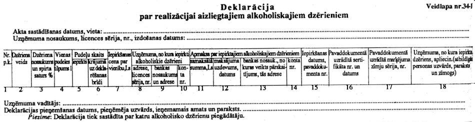 1. Uzņēmumi, kuri ir iegādājusies, pieņēmusi realizācijai vai uz citiem nosacījumiem alkoholiskos dzērienus, kuri norādīti minētajā Rīkojumā, veic to inventarizāciju, aizpildot deklarāciju (izņemot 18. aili), pēc pielikuma formas nr.34-1 trijos eksemplāros, no kuriem divus eksemplārus līdz 1994. gada 25. novembrim iesniedz Valsts ieņēmumu dienesta nodaļā pēc licencētā tirdzniecības punkta (veikala, noliktavas) atrašanās vietas.