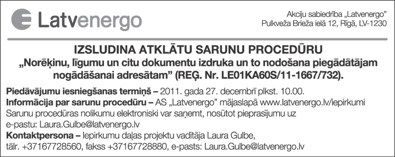 Pretendenti konkursa nolikumu var saņemt bez maksas Rīgā, Turgeņeva ielā 14, 533. vai 544.kabinetā. Konkursa piedāvājumu atvēršana notiks 2012.gada 25.janvārī plkst.10.00 Rīgā, Gogoļa ielā 3, 301. kabinetā.