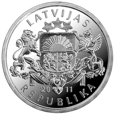 Monētas priekšpuse (averss): Centrā Latvijas lielā valsts ģerboņa attēls, zem tā gadskaitlis 2011. Monētas augšā puslokā uzraksts LATVIJAS, apakšā – REPUBLIKA. |