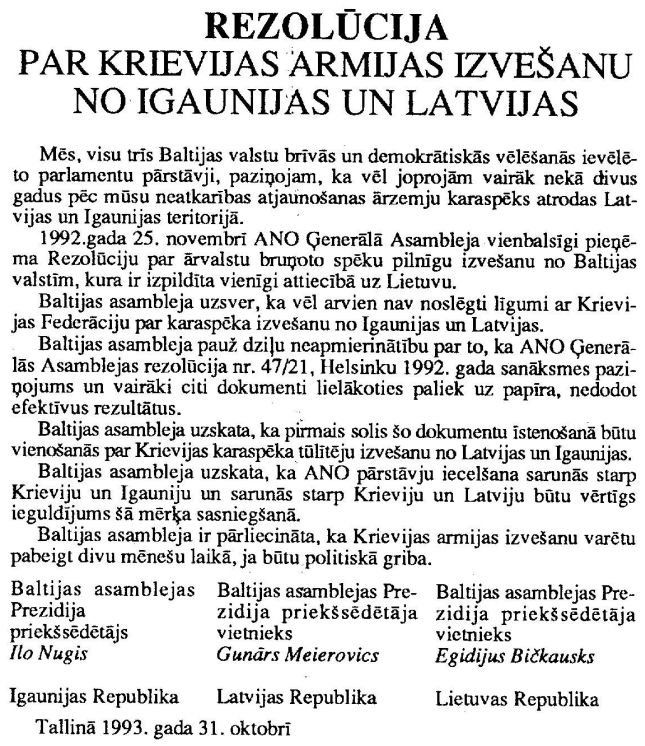 REZOLŪCIJA Par Krievijas armijas izvešanu no Igaunijas un Latvijas. Publicēts oficiālajā laikrakstā "Latvijas Vēstnesis", 3.11.1993., Nr. 100 https://www.vestnesis.lv/ta/id/241084