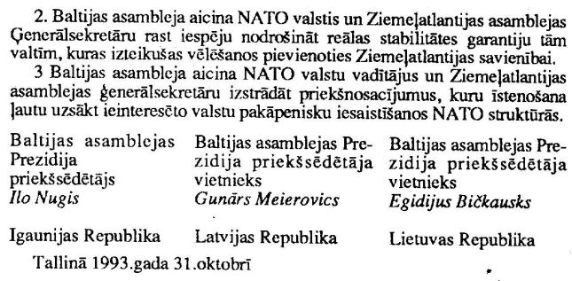 AICINĀJUMS Ziemeļatlantijas asamblejas Ģenerālsekretāram. Publicēts oficiālajā laikrakstā "Latvijas Vēstnesis", 3.11.1993., Nr. 100 https://www.vestnesis.lv/ta/id/241088