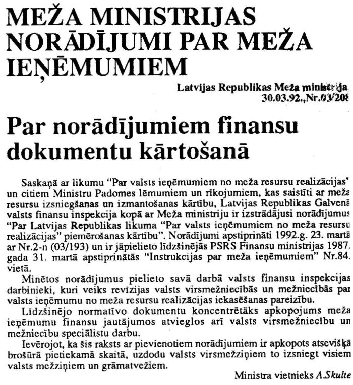 PAR DOKUMENTU Izdevējs: Meža ministrija Numurs: 03/208 Pieņemts: 30.03.1992. |