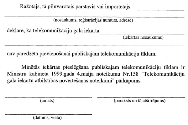 37. Ražotājam, tā pilnvarotajam pārstāvim vai importētājam, kurš ražo vai izplata tirgū iekārtas, kuras ir derīgas pieslēgšanai publiskajam telekomunikāciju tīklam, bet nav tam iepriekš paredzētas, attiecīgā iekārta jāmarķē ar šo noteikumu 2.pielikumā attēloto simbolu un iekārtai jāpievieno šo noteikumu 3.pielikumā norādītā deklarācija un lietošanas apraksts. Minētie dokumenti iesniedzami pilnvarotajā institūcijā pirms attiecīgo iekārtu izplatīšanas tirgū.