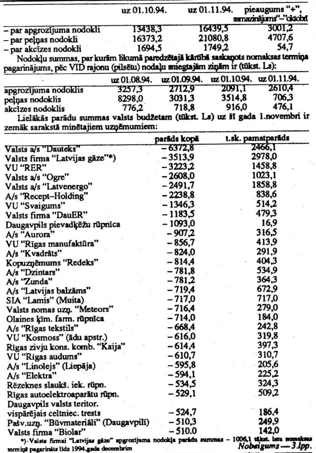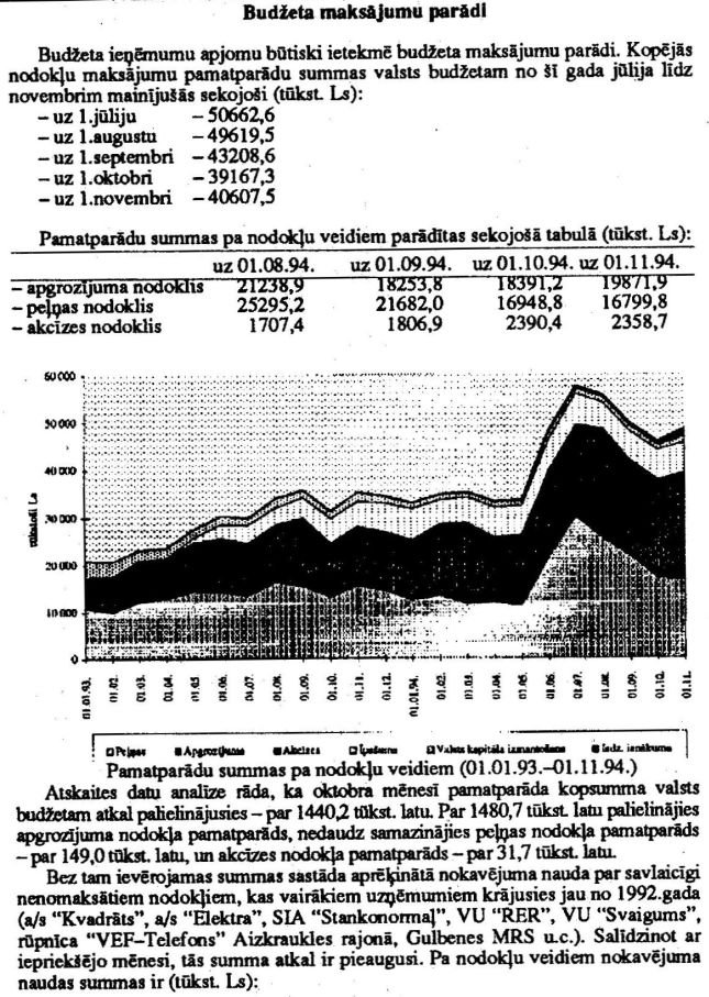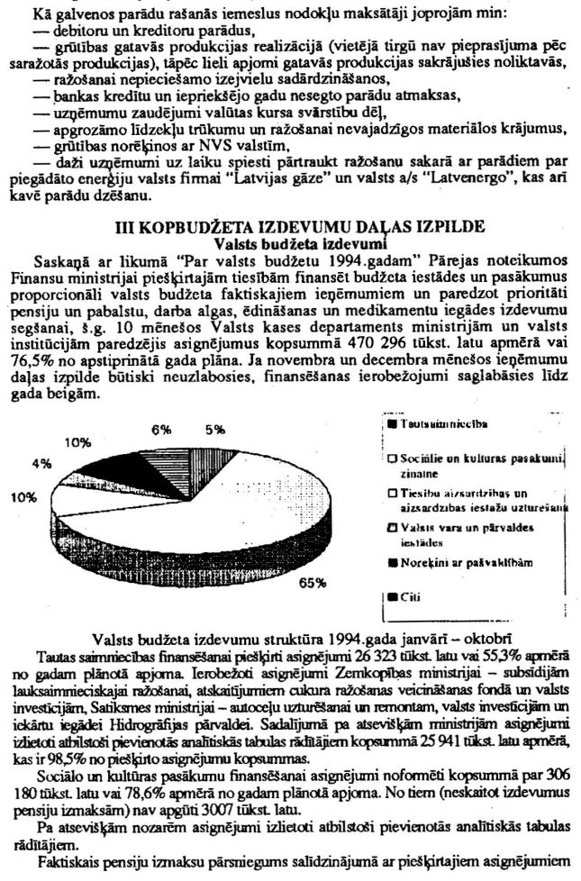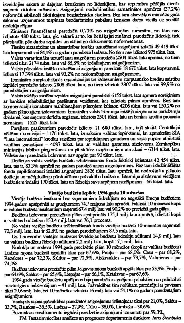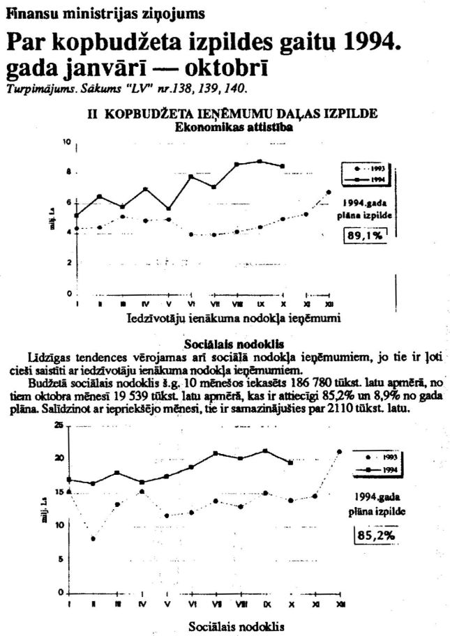Finanšu ministrijas ziņojums "Par kopbudžeta izpildes gaitu 1994.gada janvārī - oktobrī (Turpinājums)". Publicēts oficiālajā laikrakstā "Latvijas Vēstnesis", 6.12.1994., Nr. 142 https://www.vestnesis.lv/ta/id/241510