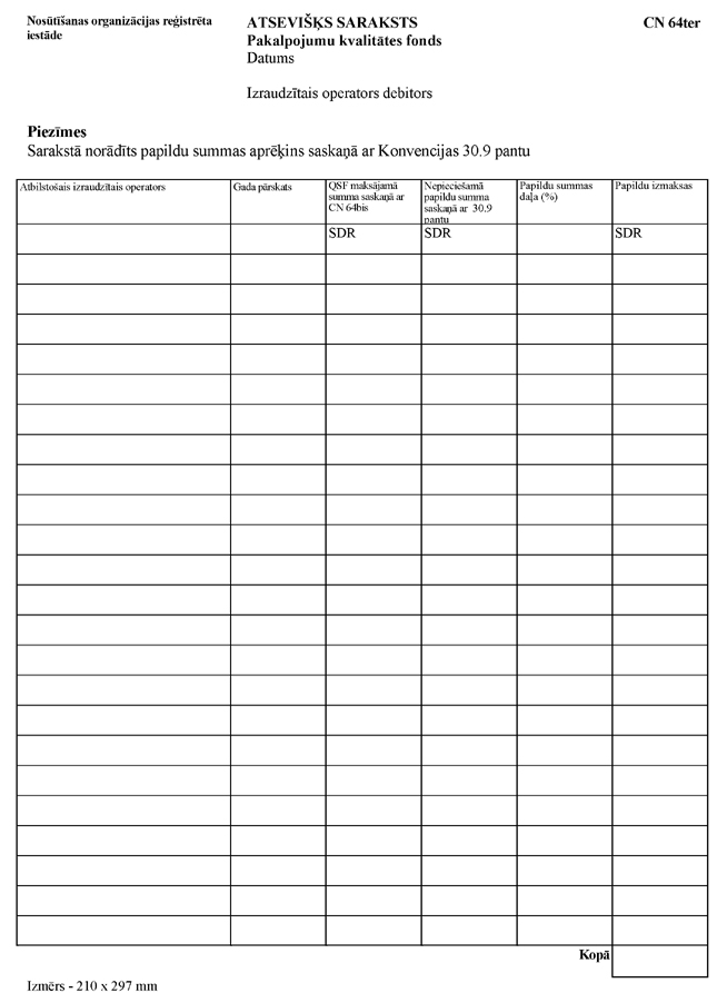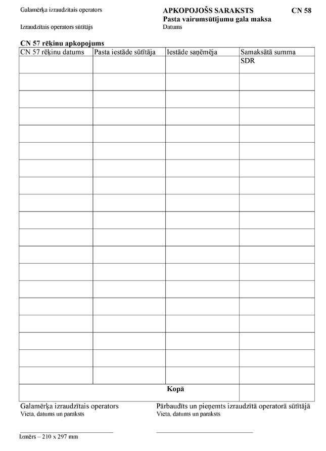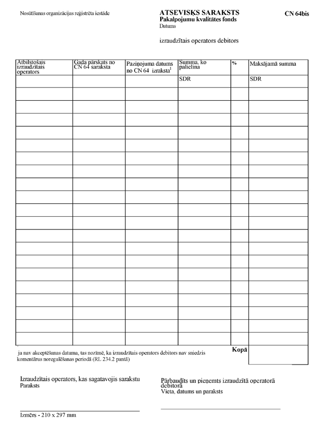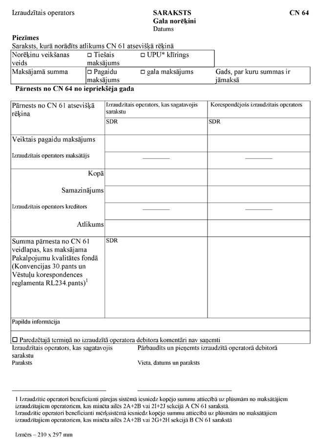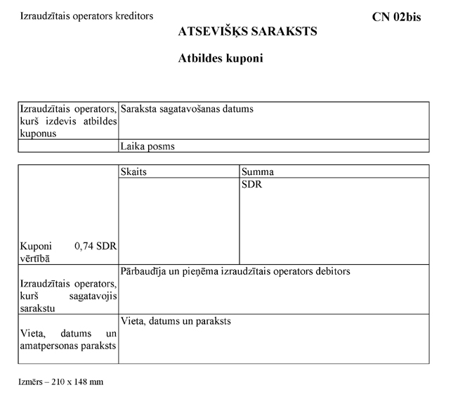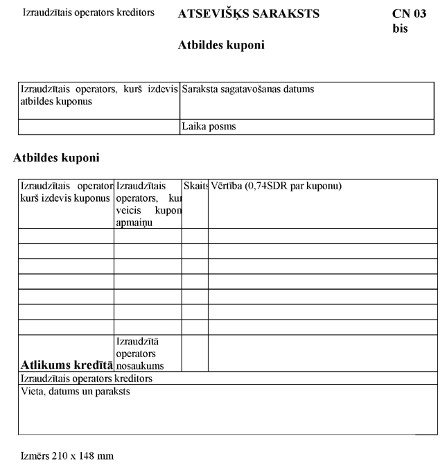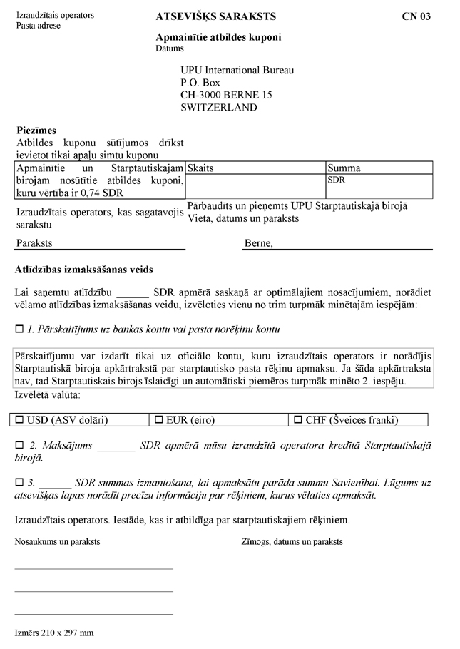 6. Tiklīdz divi izraudzītie operatori ir vienojušies par savstarpējās attiecībās apmainīto atbildes kuponu skaitu, izraudzītais operators kreditors divos eksemplāros sagatavo un nosūta izraudzītajām operatoram debitoram sarakstu, kas atbilst pievienotajam CN 03bis paraugam, ja atlikums ir lielāks par 74 SDR un ja starp attiecīgajiem izraudzītajiem operatoriem nav panākta vienošanās par īpašiem noteikumiem. Ja mēneša laikā pēc minētā saraksta nosūtīšanas izraudzītais operators kreditors nav saņēmis komentārus, tad sarakstā norādīto summu uzskata par pilnīgi pieņemtu.