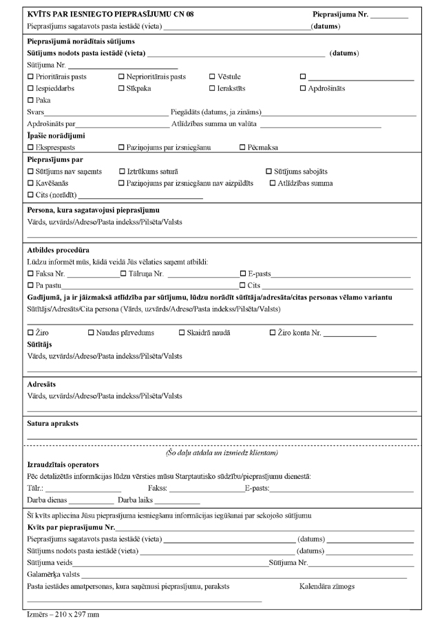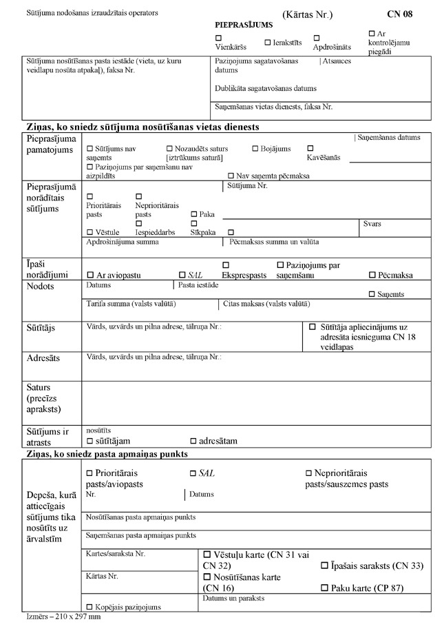 1. Neatkarīgi no RL 150. panta Amerikas Savienotās Valstis patur tiesības no sūtījuma nodošanas izraudzītā operatora nepieņemt CN 08 pieprasījumu veidlapu par ierakstītiem sūtījumiem, kas nosūtīti kā atklātā tranzīta sūtījumi, un atsakās uzņemties atbildību par šāda veida aizliegtajiem sūtījumiem.