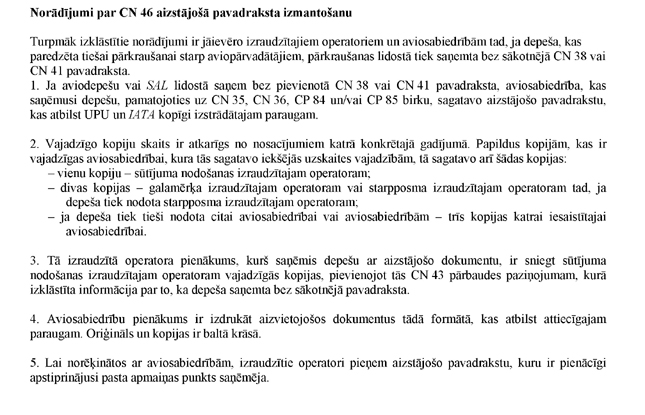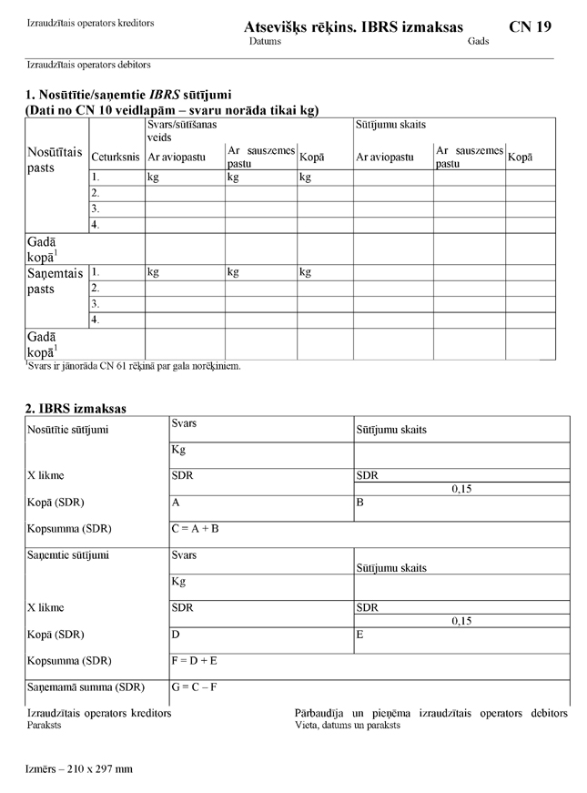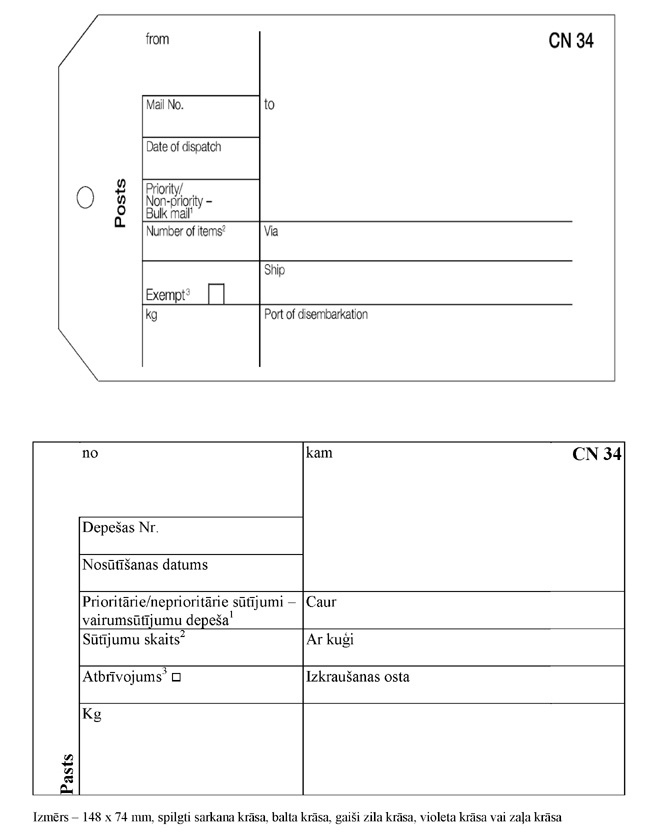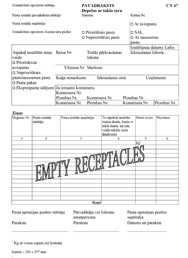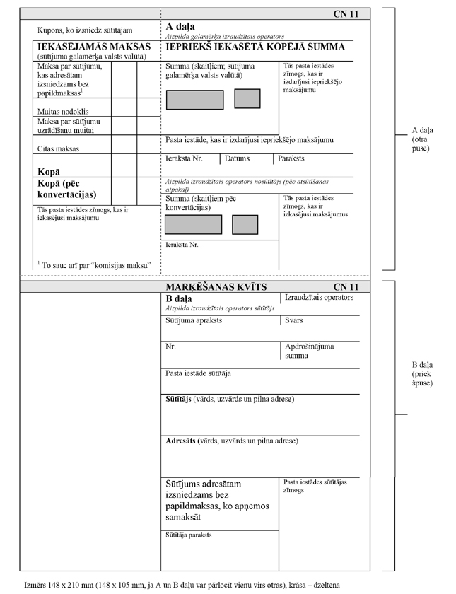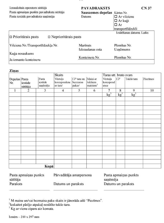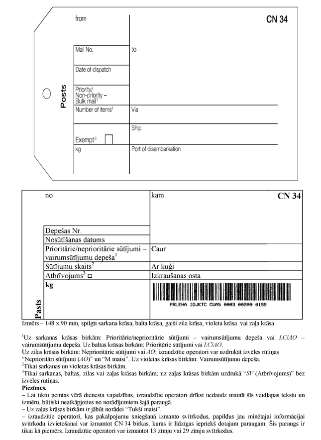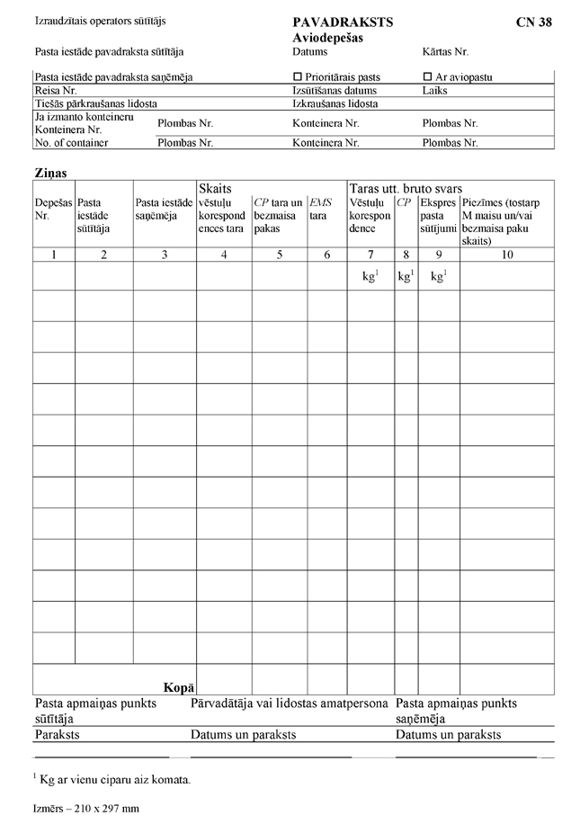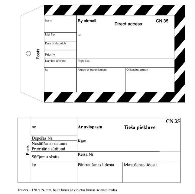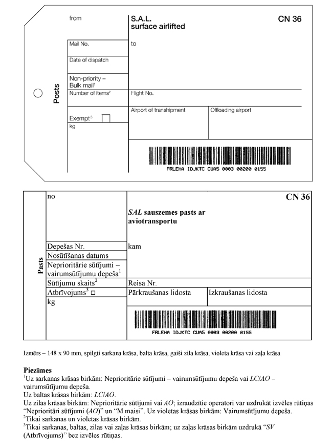 1. Azerbaidžāna, Bolīvija, Igaunija, Latvija, Tadžikistāna, Turkmenistāna un Uzbekistāna atzīst tikai tādas pārvadāšanas izmaksas, ko veic saskaņā ar norādījumiem par reisu CN 35 aviopasta sūtījumu maisu birkās un CN 38 pavadrakstos.