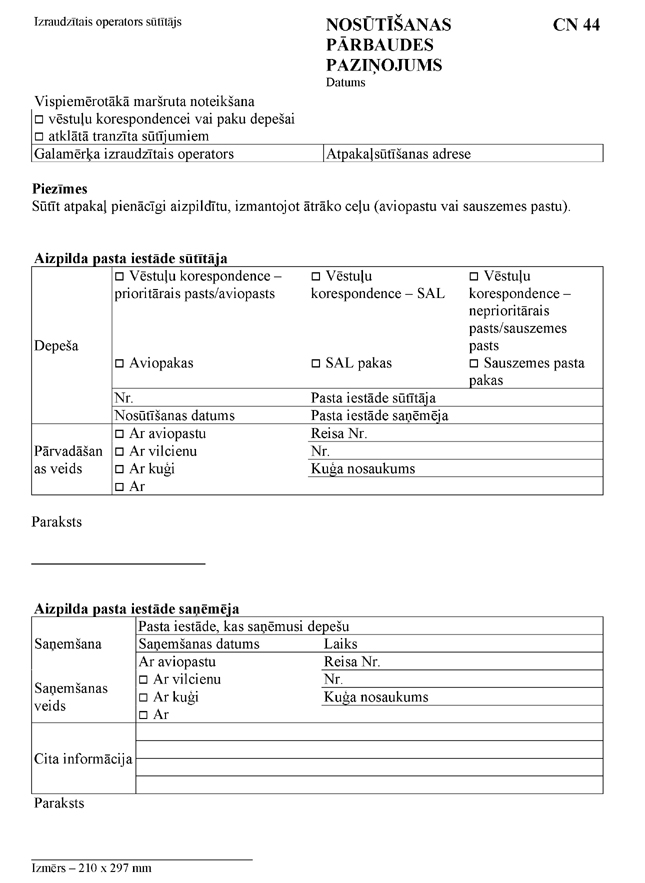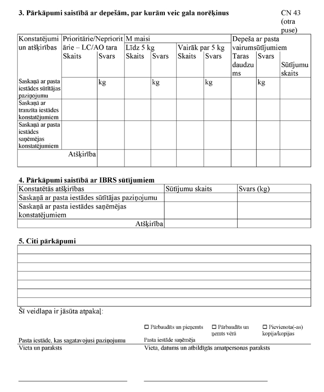 1. Neatkarīgi no RL 152. punkta Lielbritānija un Ziemeļīrijas Apvienotā Karaliste neuzņemas atbildību par sūtītāja paraksta iegūšanu uz CN 22 un CN 23 veidlapām, lai tiktu apliecināts, ka sūtījumā nav bīstamu priekšmetu, kas ir aizliegti pasta noteikumos.