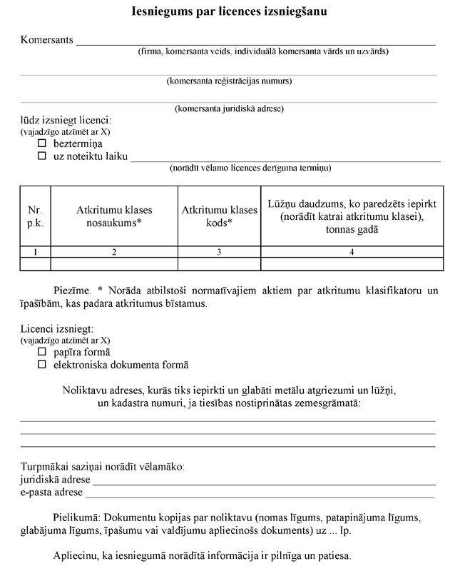 5. Lai saņemtu licenci lūžņu iepirkšanai, komersants vai tā pilnvarota persona rakstiski iesniedz Valsts vides dienestā iesniegumu par licences izsniegšanu (turpmāk – iesniegums) (1.pielikums), norādot, kādā formā vēlas saņemt licenci – papīra vai elektroniska dokumenta formā.