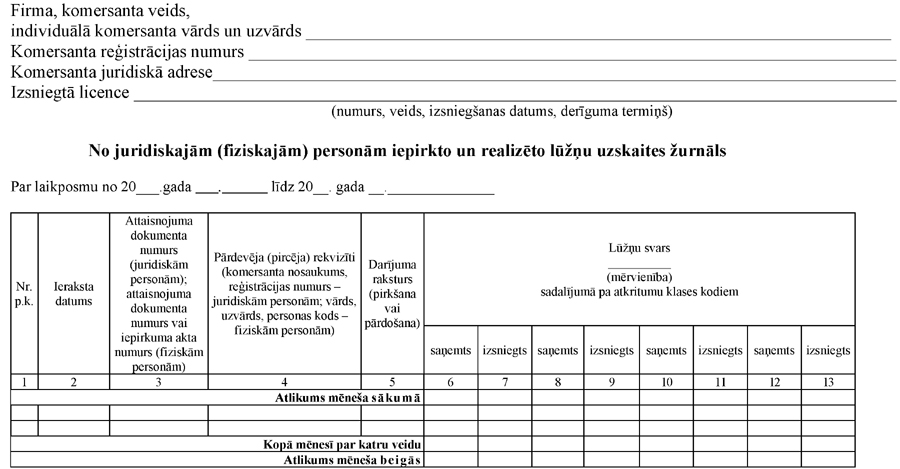 30. Ziņas par lūžņiem, kas iepirkti no fiziskajām un juridiskajām personām un pārdoti juridiskajām personām, komersants iepirkšanas (pārdošanas) dienā ieraksta no juridiskajām (fiziskajām) personām iepirkto un realizēto lūžņu uzskaites žurnālā (turpmāk – uzskaites žurnāls) (2.pielikums). Uzskaites žurnāls atrodas lūžņu iepirkšanas un uzglabāšanas vietā. Ja uzskaites žurnālu kārto elektroniski, komersants pēc kontroles institūciju pieprasījuma nodrošina iespēju izdrukāt uzskaites žurnālā iekļauto informāciju. Par uzskaites žurnālā sniegtās informācijas pareizību ir atbildīgs komersanta vadītājs.
