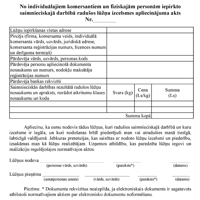 31. Saimnieciskajā darbībā radušos lūžņus no individuālajiem komersantiem un fiziskajām personām, kas Valsts ieņēmumu dienestā reģistrējušās kā saimnieciskās darbības veicējas, atļauts iepirkt tikai tad, ja pārdevējs uzrāda personu apliecinošu dokumentu un komersanta reģistrācijas apliecību vai Valsts ieņēmumu dienesta izsniegto Nodokļu maksātāja reģistrācijas apliecību. Par šādu lūžņu iepirkšanu noformē lūžņu izcelsmes apliecinājuma aktu (3.pielikums). Aktu, kas noformēts papīra formā, sastāda divos eksemplāros. Noformēto aktu glabā pārdevējs un pircējs.