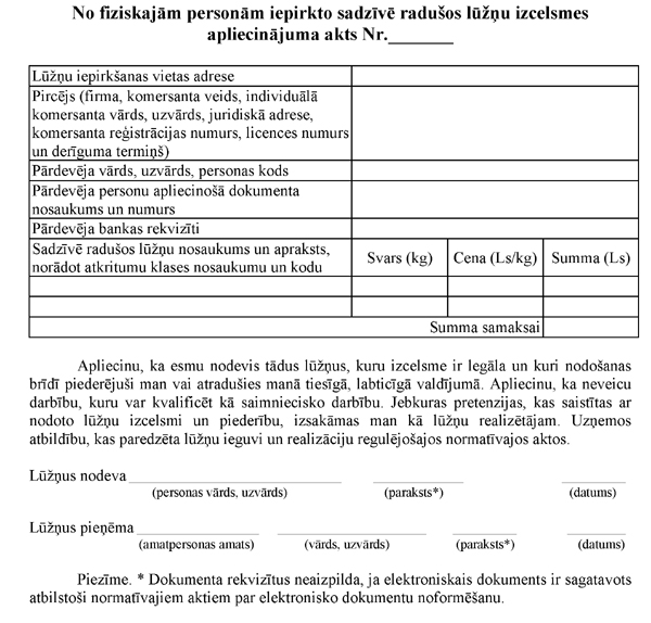 33. Ja komersants no fiziskajām personām, kas neveic saimniecisko darbību, iepērk sadzīvē radušos lūžņus vietā, kas nav licencē norādītā noliktava, viņš noformē lūžņu izcelsmes apliecinājuma aktu (5.pielikums). Aktu, kas noformēts papīra formā, sastāda divos eksemplāros. Vienu akta eksemplāru izsniedz pārdevējam, otrs paliek lūžņu pircējam. Noformēto aktu glabā pārdevējs un pircējs.