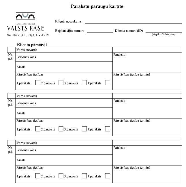 9.1. sadaļā "Klienta pārstāvji" norāda klienta personas, kuras ir pilnvarotas rīkoties ar Valsts kasē atvērtajiem klienta kontiem, minēto personu datus, amatu, pārstāvības tiesības un pašrocīgu parakstu. Kartītē norāda vismaz vienu klienta pārstāvi ar 1.paraksta tiesībām un vismaz vienu klienta pārstāvi ar 2.paraksta tiesībām. Atsevišķos gadījumos, ja to pieprasa normatīvie akti vai klienta maksājumu veikšanas kārtība, piemēro arī 3.paraksta tiesības. 4.paraksta tiesības piemēro tikai zvērinātiem tiesu izpildītājiem un viņu pilnvarotajām personām;