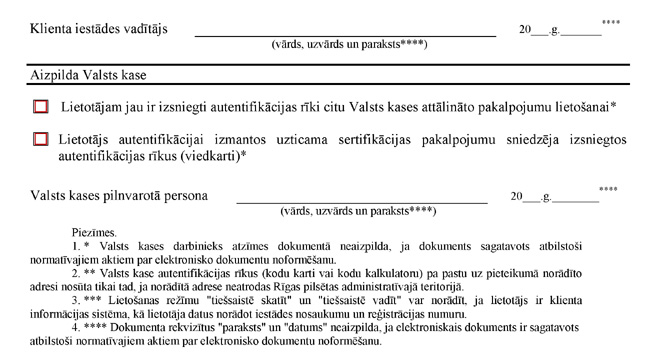 15.7. "3.paraksts" – lietotājs var parakstīt 1.paraksta un 2.paraksta pilnvaroto lietotāju autorizētus maksājuma rīkojumus, atlasīt, apskatīt un izdrukāt kontā ienākošos un no konta izejošos maksājumus un pieprasīt pārskatus. Pieejas režīms "3.paraksts" atbilst Valsts kasē iesniegtajā kartītē apstiprinātajām klienta pilnvarotā pārstāvja 3.paraksta tiesībām;