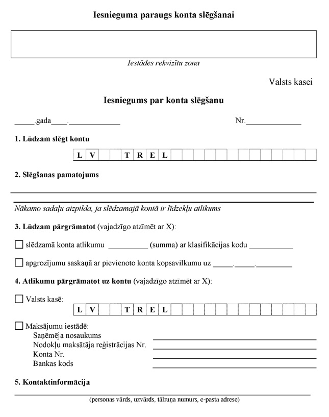 78. Klients aizpilda un iesniedz Valsts kasē iesniegumu par konta slēgšanu (9.pielikums) papīra vai elektroniska dokumenta formā, nosūtot uz e-pasta adresi kase@kase.gov.lv vai izmantojot eKasi, ja eKase to tehniski nodrošina. Ja kontā ir līdzekļu atlikums, klients iesniegumā norāda kontu, uz kuru pārgrāmatot atlikumu, un klasifikācijas kodu. Šo noteikumu 2.8.apakšpunktā minēto kontu slēdz, pamatojoties uz tieslietu ministra rīkojumu par zvērināta tiesu izpildītāja atcelšanu vai atbrīvošanu, kā arī zvērināta tiesu izpildītāja nāves gadījumā.