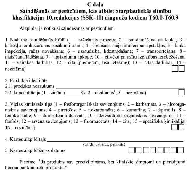"8.1 Dienests pēc pieprasījuma sniedz statistisko informāciju Rīgas Austrumu klīniskās universitātes Toksikoloģijas un sepses klīnikai par saindēšanās gadījumiem (diagnožu kodi T36.0–T65.9 atbilstoši šo noteikumu 9.punktā minētajai Starptautiskās slimību klasifikācijas 10.redakcijai) un Valsts augu aizsardzības dienestam par saindēšanās gadījumiem ar pesticīdiem (diagnožu kodi T60.0–T60.9 atbilstoši šo noteikumu 9.punktā minētajai Starptautiskās slimību klasifikācijas 10.redakcijai)."