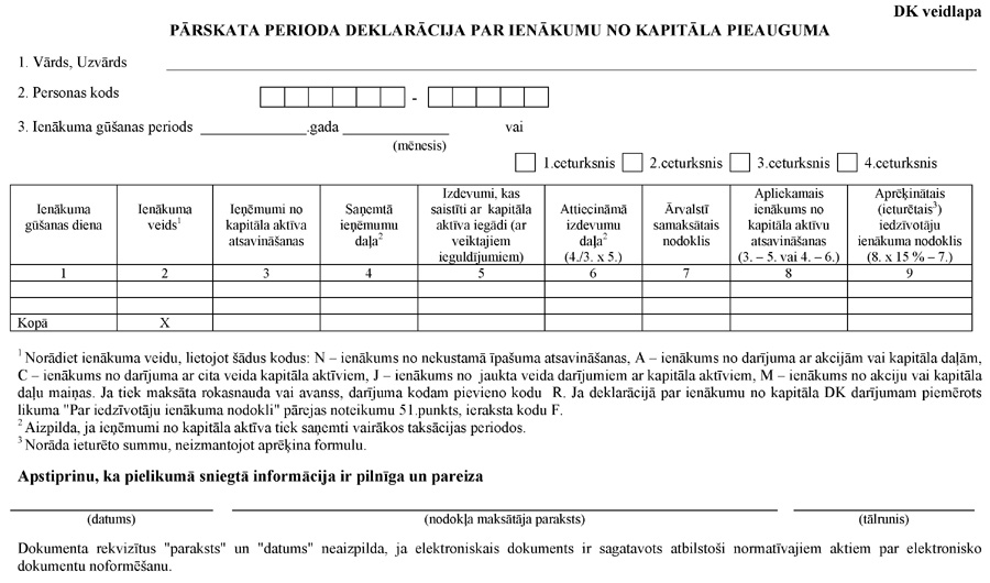2.1. pārskata perioda deklarācija par ienākumu no kapitāla pieauguma (turpmāk – DK veidlapa) un tās pielikums "Informācija par darījumiem, kas uzsākti, bet nav pabeigti vienā taksācijas gadā" (turpmāk – DK veidlapas pielikums);