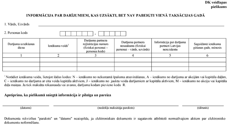 8. Nodokļa maksātājs rezidents DK veidlapas pielikumā norāda visus taksācijas periodā uzsāktos, bet nepabeigtos darījumus ar kapitāla aktīviem Latvijas Republikā vai ārvalstīs. Nodokļa maksātājs nerezidents DK veidlapas pielikumā norāda taksācijas periodā uzsāktos, bet nepabeigtos darījumus no Latvijas Republikā esoša kapitāla aktīvu atsavināšanas. DK veidlapas pielikumu par taksācijas gadu iesniedz Valsts ieņēmumu dienestā reizi gadā līdz taksācijas gadam sekojošā gada 1.jūnijam.