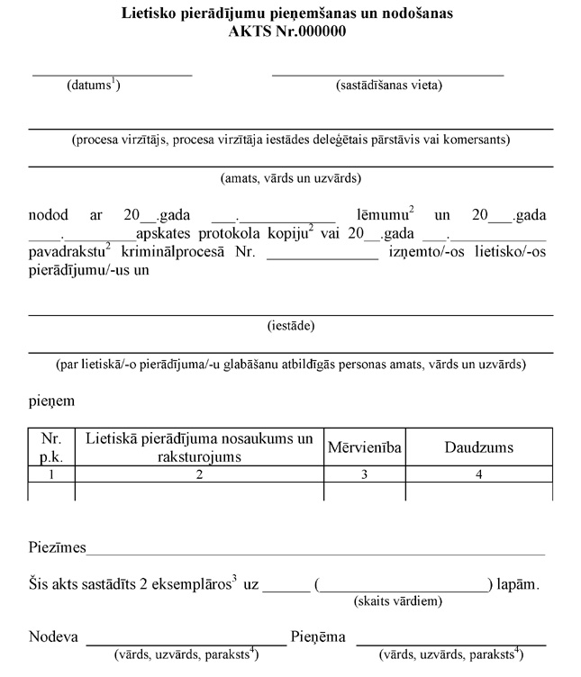61. Par lietiskā pierādījuma glabāšanu atbildīgā persona lietisko pierādījumu no lietisko pierādījumu glabātavas izsniedz saskaņā ar procesa virzītāja lēmumu procesuālo darbību veikšanai, sastādot lietisko pierādījumu pieņemšanas un nodošanas aktu divos eksemplāros (nav attiecināms, ja aktu sastāda elektroniska dokumenta veidā), no kuriem vienu eksemplāru izsniedz procesa virzītājam pievienošanai krimināllietas materiāliem, bet otru saglabā lietisko pierādījumu glabātavas lietvedībā.
