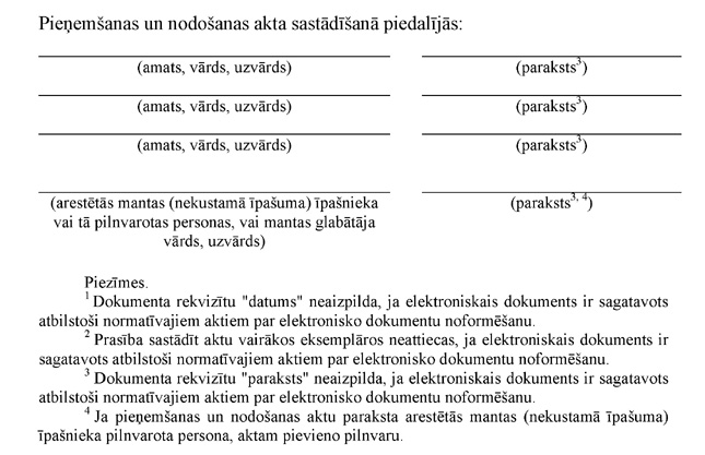 70. Pašvaldības pilnvarotais pārstāvis pēc tam, kad saņemta procesa virzītāja lēmuma kopija par mantas aresta atcelšanu, nekavējoties, bet ne vēlāk kā triju darbdienu laikā sastāda mantas vai arestētās mantas (nekustamā īpašuma), vai mantas, kurai atcelts arests, pieņemšanas un nodošanas aktu trijos eksemplāros (nav attiecināms, ja aktu sastāda elektroniska dokumenta veidā), piedaloties procesa virzītājam vai citai personai viņa uzdevumā, kā arī personai, kuras mantai vai nekustamajam īpašumam bija uzlikts arests. Ja manta vai nekustamais īpašums bija nodots uzraudzībā, pieaicina arī personu, kura nodrošinājusi mantas vai nekustamā īpašuma uzraudzību, vai tās pilnvarotu pārstāvi. Akta vienu eksemplāru izsniedz personai, kas nodrošinājusi mantas vai nekustamā īpašuma uzraudzību, vai tās pilnvarotam pārstāvim, otru – procesa virzītājam vai citai personai, kas piedalījās viņa uzdevumā arestētās mantas (nekustamā īpašuma) vai mantas, kurai atcelts arests, pieņemšanas un nodošanas akta sastādīšanā, kā arī personai, kuras mantai vai nekustamajam īpašumam bija uzlikts arests.