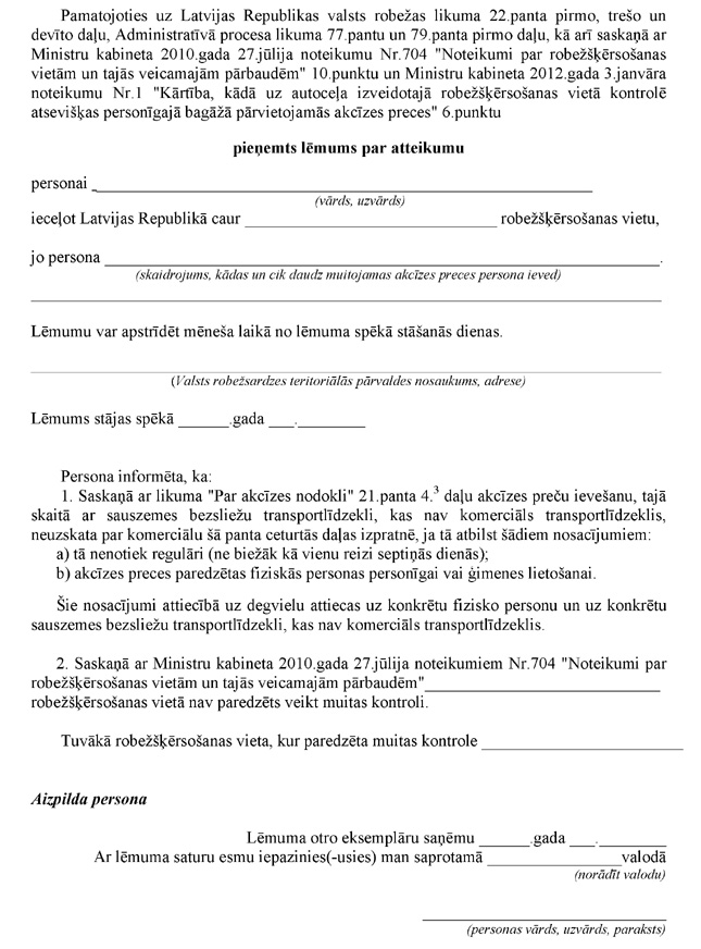 6. Ja Valsts robežsardzes amatpersona autoceļa robežšķērsošanas vietā, kurā muitas kontrole nav paredzēta, konstatē personas pienākumu maksāt normatīvajos aktos paredzētos maksājumus par atsevišķām akcīzes precēm, Valsts robežsardzes amatpersona pieņem lēmumu par atteikumu personai ieceļot Latvijas Republikā ar akcīzes precēm, kas nav atbrīvotas no nodokļiem (2.pielikums), un informē par tuvāko robežšķērsošanas vietu, kur paredzēta muitas kontrole.