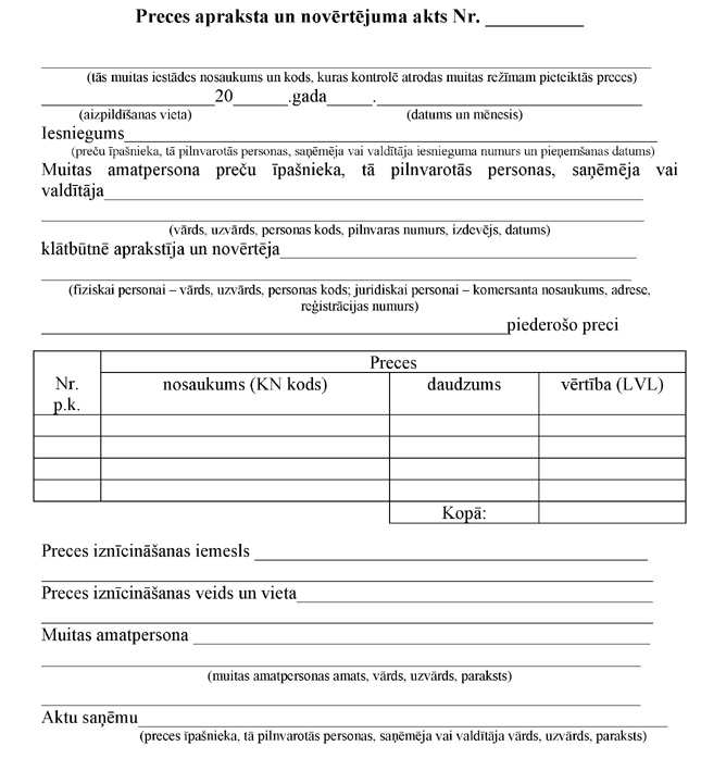 9. Pirms preču iznīcināšanas muitas amatpersona aizpilda preces apraksta un novērtējuma aktu (1.pielikums).