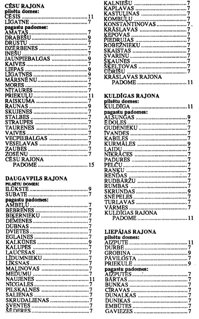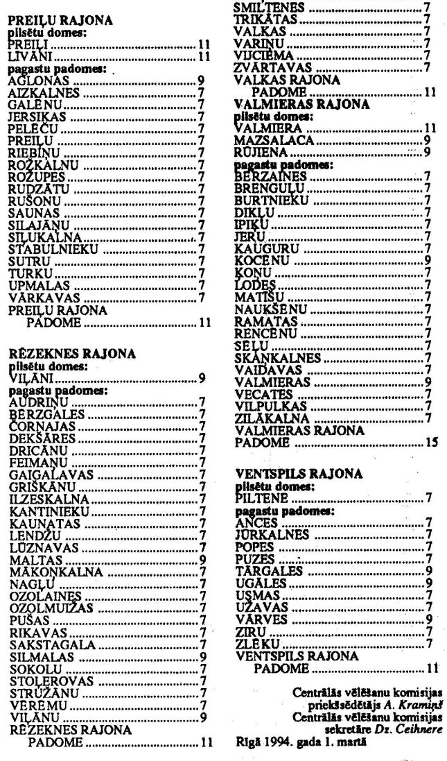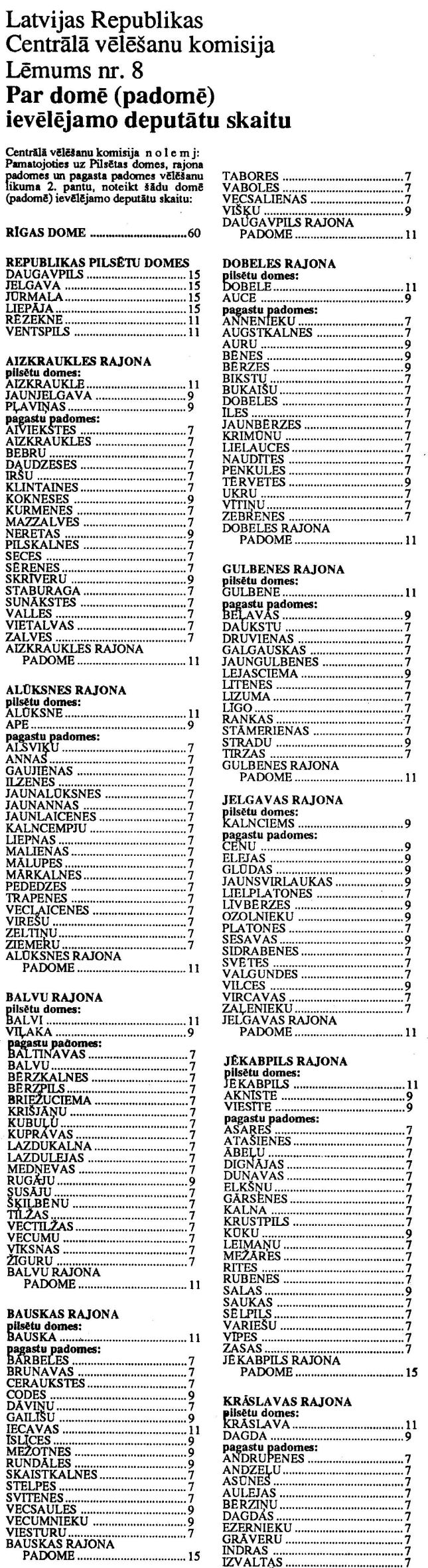 Centrālās vēlēšanu komisijas 1994. gada 1. marta lēmums Nr. 8 "Par domē (padomē) ievēlējamo deputātu skaitu". Publicēts oficiālajā laikrakstā "Latvijas Vēstnesis", 18.03.1994., Nr. 34 https://www.vestnesis.lv/ta/id/242794