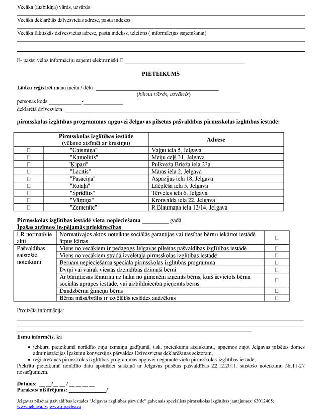 | 5. Informācija par administratīvajām procedūrām | Papildus jau esošajām administratīvajām procedūrām bērnu reģistrēšanai un uzņemšanai pašvaldības izglītības iestādēs, Jelgavas izglītības pārvalde slēgs līgumu starp Jelgavas izglītības pārvaldi, vecākiem un privāto izglītības iestādi par pašvaldības līdzfinansēta pirmsskolas izglītības pakalpojuma nodrošināšanu. |