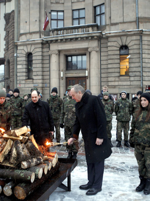 | Piektdien, 20.janvārī, 1991.gada barikāžu aizstāvju atceres dienā, Saeimas priekšsēdētāja Solvita Āboltiņa, Saeimas namā tiekoties ar tā laika žurnālistiem (attēlā pa kreisi); Valsts prezidents Andris Bērziņš kopā ar 1991.gada barikāžu muzeja direktoru Renāru Zaļo, Doma laukumā aizdedzot piemiņas ugunskuru (attēlā pa labi)… | |