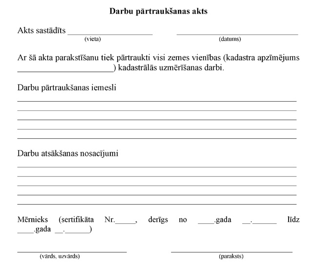 17. Ja mērnieks nevar uzsākt vai turpināt zemes kadastrālās uzmērīšanas darbus ierosinātāja darbības vai bezdarbības dēļ, mērnieks sastāda darba pārtraukšanas aktu (1.pielikums). Darba pārtraukšanas akta apliecinātu kopiju nosūta ierosinātājam un pierobežniekam, ja viņš to ir pieprasījis, bet oriģinālu mērnieks kopā ar sagatavotajiem zemes kadastrālās uzmērīšanas dokumentiem uzglabā savā lietvedībā.