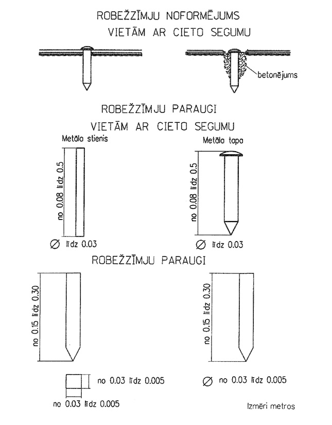 2.7. robežposmiem starp apvidū nostiprinātiem robežpunktiem pieraksta attālumu bez projekcijas mēroga labojumiem metros (ar precizitāti līdz centimetram). Attālumus norāda plāna grafiskajā daļā vai apkopo tabulā, kurā norāda robežpunktu numurus. Apvidū nenostiprināto robežpunktu numurus atzīmē ar ''*'';