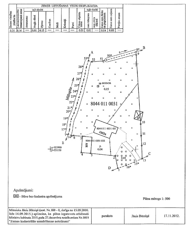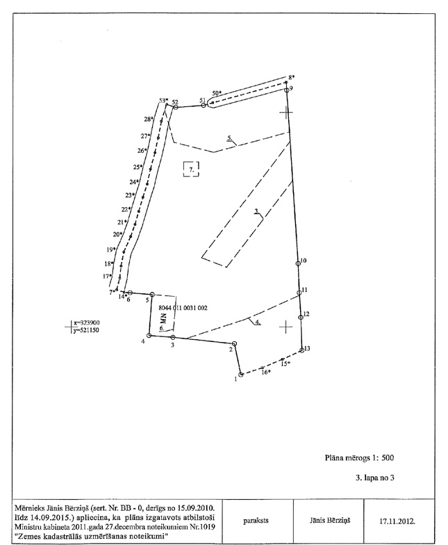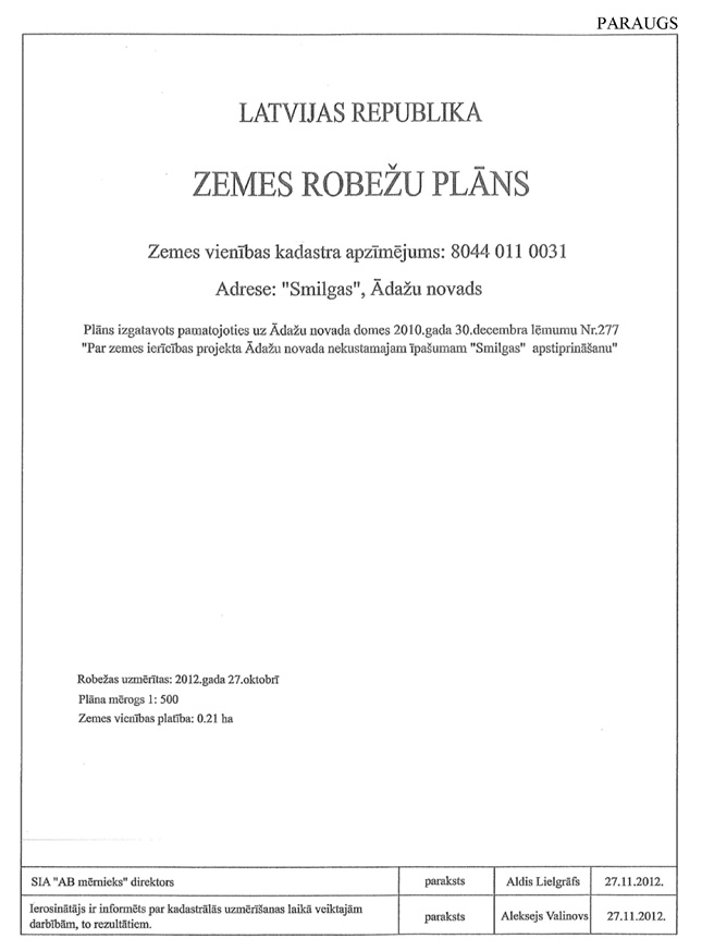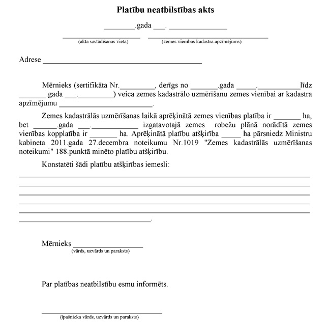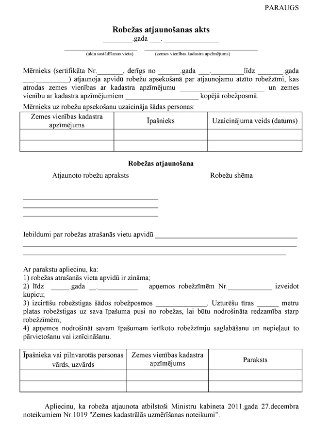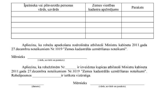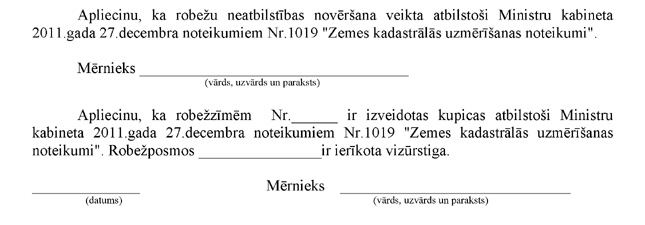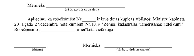 3.3.2. mērnieka apliecinājumu, ka plāns izgatavots atbilstoši Ministru kabineta 2011.gada 27.decembra noteikumiem Nr.1019 "Zemes kadastrālās uzmērīšanas noteikumi". Apliecinājuma datums uzskatāms par plāna izgatavošanas datumu.