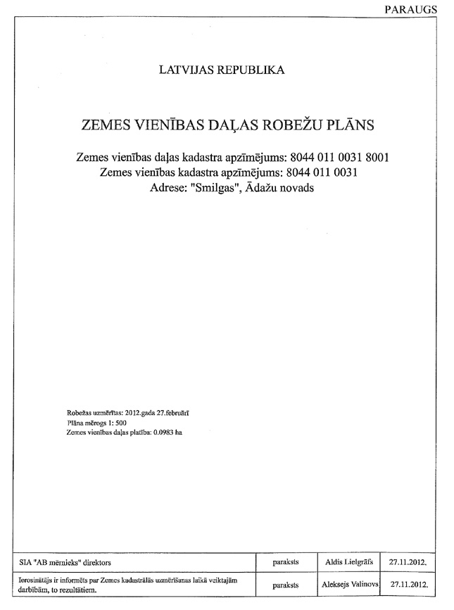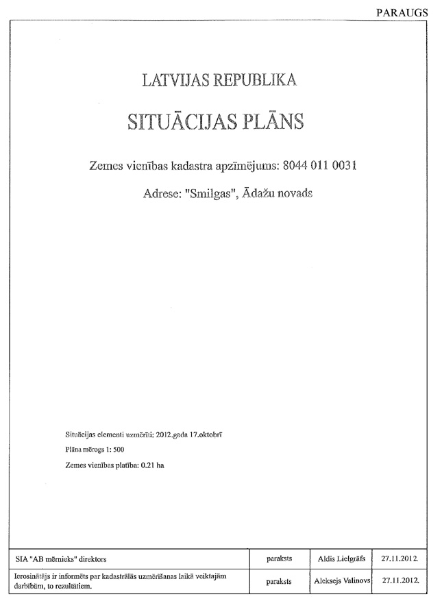 2.8.2. mērnieka apliecinājumu, ka plāns izgatavots atbilstoši Ministru kabineta 2011.gada 27.decembra noteikumiem Nr.1019 ''Zemes kadastrālās uzmērīšanas noteikumi''. Apliecinājuma datums uzskatāms par plāna izgatavošanas datumu.
