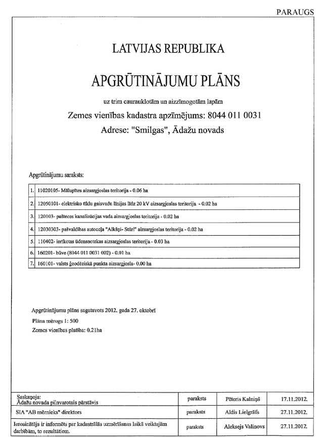 20.3. dokumentu par apgrūtinājuma noteikšanu, arī servitūta nodibināšanu, ja tas nav reģistrēts Kadastra informācijas sistēmā un ierakstīts zemesgrāmatā;