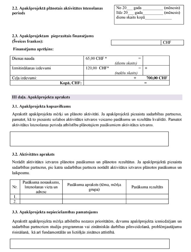 30. Apakšprojekta iesniedzējs apakšprojekta iesniegumu iesniedz starpniekinstitūcijā personīgi vai nosūta pa pastu, uz aploksnes norādot "Šveices pētnieku aktivitātes Latvijā", vai iesniedz elektroniski.