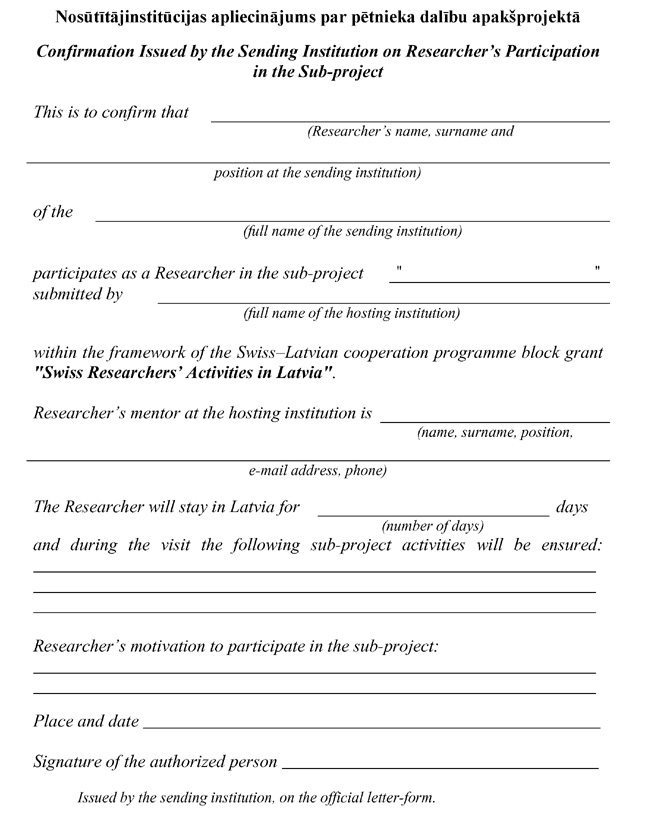 nosūtītājinstitūcijas izsniegts apliecinājums (angļu valodā) par pētnieka dalību apakšprojektā (3.pielikums) |