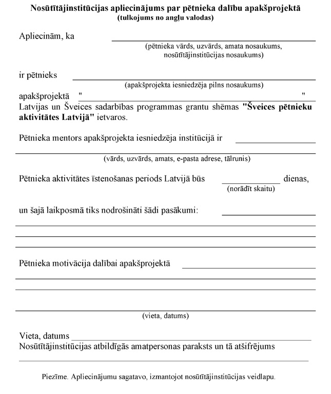 Apakšprojekta iesniegumam ir pievienoti Ministru kabineta 2012.gada 17.janvāra noteikumu Nr.62 ''Latvijas un Šveices sadarbības programmas grantu shēmas "Šveices pētnieku aktivitātes Latvijā" apakšprojektu iesniegumu atklāta konkursa nolikums'' 29.punktā minētie pielikumi: | ||