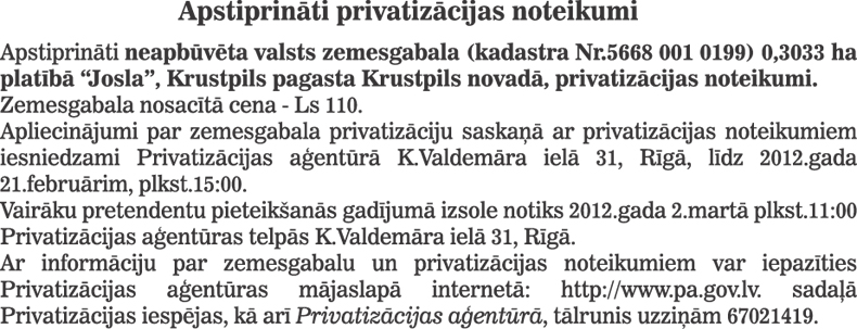 Privatizācijas ziņas. Publicēts oficiālajā laikrakstā "Latvijas Vēstnesis", 2.02.2012., Nr. 19 https://www.vestnesis.lv/ta/id/243597