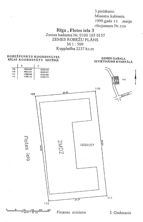 1.3. zemesgabalu 2237 m2 platībā (zemes kadastra Nr. 0100 103 0157) un kluba ēku Rīgā, Flotes ielā 3. Zemesgabala robežas norādītas 3.pielikumā.