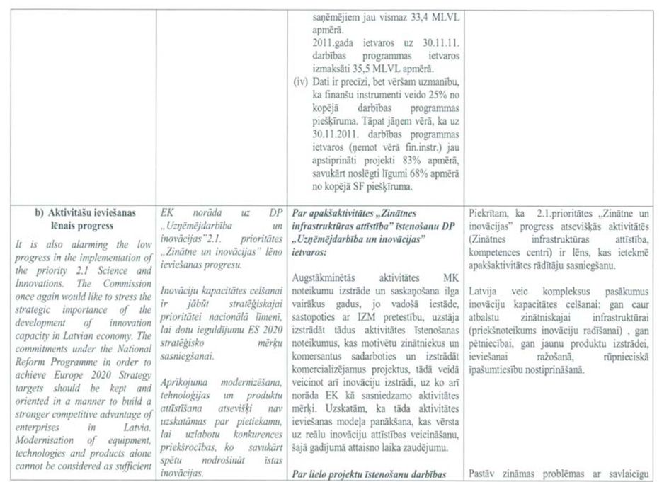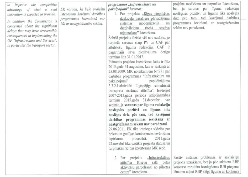 FM ir saņēmusi Eiropas Komisijas (turpmāk – EK) Reģionu politikas ģenerāldirektorāta (turpmāk – DG REGIO) 2011.gada 9.decembra vēstuli Ares (2001)1334502 par darbības programmu „Uzņēmējdarbības un inovācijas” un „Infrastruktūra un pakalpojumi” īstenošanas problēmām (turpmāk – vēstule), kura tika nosūtīta pēc FM darba tikšanās 2011.gada 8.decembrī ar DG REGIO pārstāvjiem par iespējamajiem grozījumiem darbības programmās. Iepriekšminētā vēstule tiek izmantota turpmāko dokumentu gatavošanā un rīcībās, un tā tika gaidīta pēc notikušās ikgadējās sanāksmes ar DG REGIO par ES fondu ieviešanu 2010.gadā, kura notika FM 2011.gada 13.septembrī. Vēstules saturs vairākos jautājumos norādīts nekorekti, un tas ir pārrunāts ar DG REGIO pārstāvjiem darba tikšanās laikā š.g. 18.janvārī, tādējādi atbildot un kliedējot EK izrādītās bažas un kritiku par ES fondu ieviešanas problēmām.