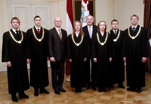 Vakar, 15.februārī: Valsts prezidents Andris Bērziņš un tieslietu ministrs Gaidis Bērziņš Rīgas pilī pēc zvēresta (svinīgā solījuma) nodošanas kopā ar jaunajiem rajona (pilsētas) tiesas tiesnešiem – Uldi Apsīti, Kristīni Brokani, Romānu Dončenko, Pēteri Novičenoku, Māri Markovu un Agnesi Pūcīti Foto: VPK