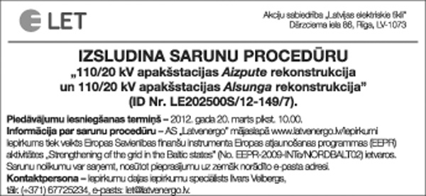 Aizlīmētajai aploksnei jābūt marķētai ar uzrakstu "KONFIDENCIĀLI. Konkursam "Vilces ritošā sastāva mezglu un agregātu remonta veikšana", neatvērt līdz 2012. gada 8. martam plkst. 10.00".