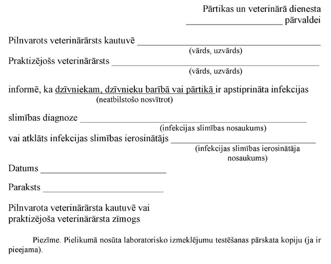 8. Ja ir apstiprināta šo noteikumu 1.pielikuma II daļā minētā infekcijas slimība dzīvniekiem vai šīs slimības ierosinātāja esība vidē, dzīvnieku barībā vai pārtikā, pilnvarots veterinārārsts kautuvē vai praktizējošs veterinārārsts vienas darbdienas laikā par to ziņo attiecīgajai dienesta teritoriālajai struktūrvienībai (2.pielikums).