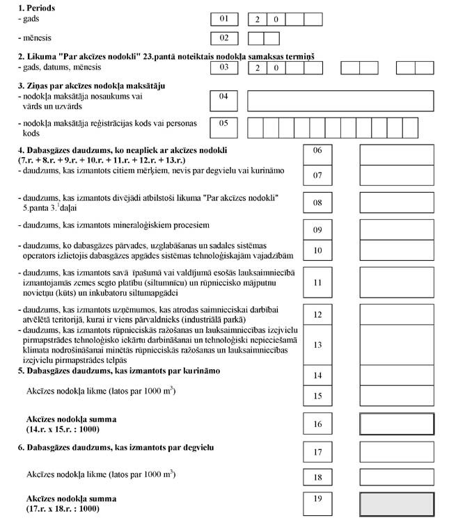 "10.1. 22.rindā – kopējo taksācijas periodā faktiski saņemto naftas produktu daudzumu. Ja saņemtie naftas produkti vai daļa no saņemtā daudzuma atbrīvota no akcīzes nodokļa saskaņā ar likuma 18.panta pirmo daļu, attiecīgo daudzumu norāda arī naftas produktu deklarācijas 33.rindā ar "–" zīmi, 37.rindā norādot atbrīvojuma pamatojumu;";